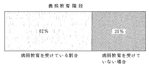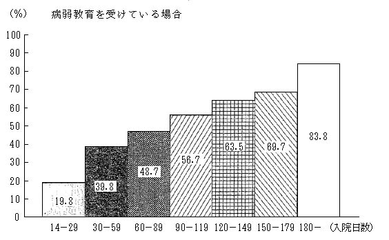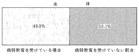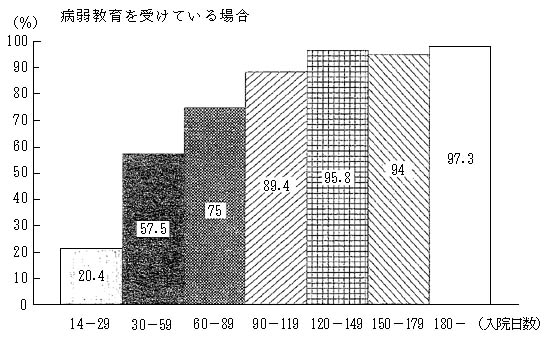 なお、本調査研究の一環として、小児科のある三〇〇床以上の病院に対し、平成六年三月一日現在で通算二週間以上入院している児童生徒の教育措置の状況について調査が行われた。この調査の結果から、養護学校等の教育を受けている児童生徒の割合を見ると、義務教育段階では全体の約六二、〇%にすぎないものとなっている。ただし、病気の種類や病状等により入院期間はさまざまであり、これに応じて、入院中の病気療養児の教育措置の在り方についても異なったものとなっているのが現状である。