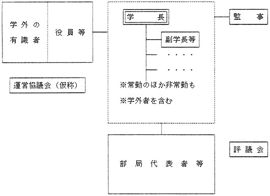 新しい「国立大学法人」像について(中間報告) (目次) はじめに [Roman1 ] 基本的な考え方 一 検討の前提 二 検討の視点 [Roman2 ] 組織業務 一 検討の視点 二 制度設計の方針 (一) 法人の基本 (二) 運営組織 (三) その他の組織 (四) 目的・業務 [Roman3 ] 目標評価 一 検討の視点 二 制度設計の方針 (一) 国のグランドデザイン等と大学の長期目標 (二) 中期目標・中期計画等 (三) 評価 (四) 情報公開 [Roman4 ] 人事制度 一 検討の視点 二 制度設計の方針 (一) 身分 (二) 選考・任免等 (三) 給与 (四) 服務・勤務時間 (五) 人員管理 [Roman5 ] 財務会計制度 一 検討の視点 二 制度設計の方針 (一) 中期計画と予算 (二) 運営費交付金 (三) 施設整備費 (四) 土地・建物等 (五) 長期借入金債務 (六) 寄附金等 (七) 会計基準等 [Roman6 ] 大学共同利用機関 一 検討の視点 二 制度設計の方針 (一) 組織業務 (二) 目標評価 (三) 人事制度 (四) 財務会計制度 (五) その他 [Roman7 ] 関連するその他の課題 はじめに 二一世紀は、「知」の時代と言われる。「知」の時代にあって、我が国は、学問と文化の継承、発展、創造を通じ、国際社会への新たな価値の発信が求められている。二一世紀における大学の責務は、極めて重大である。 本調査検討会議は、昨年七月、独立行政法人制度の下で、大学の特性に配慮しつつ、国立大学等を法人化する場合の法令面や運用面での対応など、制度の具体的な内容について必要な調査検討を行うことを目的として発足した。 以来、本調査検討会議は、公私立大学とともに我が国の「知」を支える国立大学及び大学共同利用機関の在り方を問い直そうと試みてきた。描こうとしたものは、法人化後の新しい国立大学等の姿である。目指したものは、法人化を契機とした国立大学等の改革と新生である。 会議には、国立大学、大学共同利用機関、私立大学、公立大学、経済界、言論界など各界から関係者が集い、約一年にわたってほぼ毎週のように委員会を開催し、議論を重ねた。 その間、本年六月には、文部科学大臣から、「大学(国立大学)の構造改革の方針」が公表された。活力に富み国際競争力のある国公私立大学づくりの一環として、[cir1 ]国立大学の再編・統合、[cir2 ]民間的発想の経営手法を導入した「国立大学法人」への移行、[cir3 ]第三者評価による競争原理の導入と国公私「トップ三〇」の育成、の三本の方針が示されている。 このうち、主に[cir2 ]及び[cir3 ]は本調査検討会議の検討内容とも深く関連するものであり、本年六月以降は、国立大学の構造改革という新たな動向にも留意しつつ検討を深めてきたが、発足以来ほぼ一年を経過するに至り、これまでの調査検討の成果を、現時点において中間報告の形で整理し、広く公表することとした。 今後、中間報告について広く各界からの意見を求め、今年度中に最終報告をとりまとめることを予定している。 [Roman1 ] 基本的な考え方 一 検討の前提(国立大学の法人化を検討する場合に、まず前提とされるべき基本的な考え方の整理) 前提一‥「大学改革の推進」 国立大学の法人化は、閣議決定でも確認されているとおり、大学改革を推進するための一環として検討が行われるべきものである。 すなわち、この問題は、行政機能のアウトソーシングや、運営の効率性の向上、透明性の確保といったいわば行政改革の視点を越えて、教育研究の高度化、個性豊かな大学づくり、大学運営の活性化など、従来からの大学改革の流れを一層促進し、活力に富み国際競争力のある大学づくりの一環として検討することが前提となる。 また、そのためには、現在の国立大学に、単に法人格を付与するとか、既存の法人制度の枠組みに単純に当てはめるといった消極的な発想ではなく、予算、組織、人事など経営面での諸規制が大幅に緩和され、大学の裁量が拡大するといった法人化のメリットを大学改革のために最大限に活用するという積極的な発想に立って、新しい国立大学の姿を模索する必要がある。 さらに、国立大学の法人化が、国立大学だけの改革にとどまらず、我が国の大学全体の活性化と教育研究の高度化に真に資する契機となるためには、その前提として、国公私を通じて、第三者評価に基づく重点投資のシステムの導入など競争原理の導入や効率的運営を図りつつ、高等教育や科学技術・学術研究に対する公的支援を拡充することが不可欠である。 前提二‥「国立大学の使命」 国立大学の法人化に当たり、法人化のメリットを最大限に活用した新しい国立大学像を模索する一方、国立大学が本来果たすべき使命や機能を、いかに従来以上に十全に実現させ得るかという観点が、検討の前提として必要である。 国立大学に期待される使命や機能については、すでに大学審議会答申等でも整理されているが、国立大学は、今日まで我が国の学術研究と研究者養成を担ってきたほか、全国的に均衡のとれた配置により、地域の教育、文化、産業の基盤を支え、学生に経済状況に左右されない進学