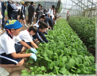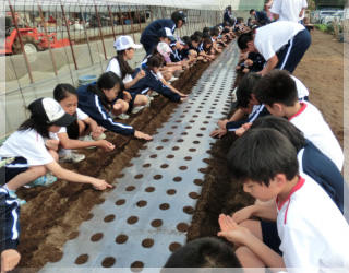 学校では、給食の時間を始めとして関連する教科などで食について学びます。 体験学習では、実際にイネや野菜などを自分たちで栽培・収穫し、生産の大変さ、食べ物の大切さなどを体験していきます。