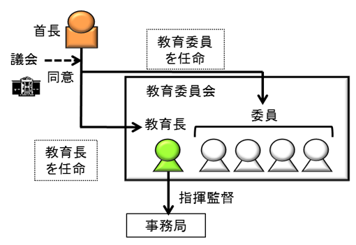 - 教育委員会は、常勤の教育長1人と非常勤の教育委員4人の原則5人で構成。任期は教育長は3年、教育委員は4年でそれぞれ再任可。