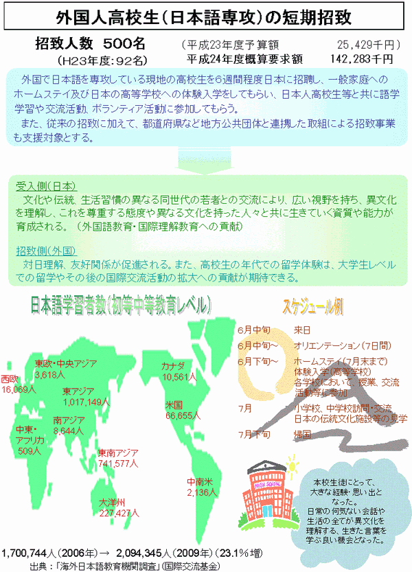 なお、高校生の留学促進事業は、当初は1人5万円を1,000人、平成19年度からは1人50万円を50~60人の間で(平成21年度は補正予算により330人を追加)支援してきているとともに、外国人高校生(日本語専攻)の短期招致事業は、これまで92~160人の間で招致してきている。