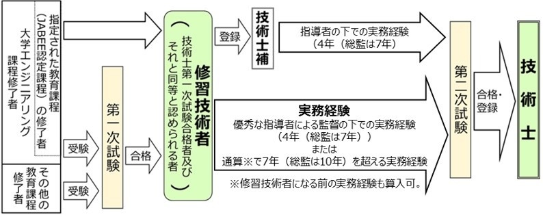 ・技術士第一次試験合格者及びJABEE課程修了者を修習技術者といい、日本技術士会へ登録することで技術士補になることができます。技術士補は技術士の指導のもとで技術的な業務を補助する国家資格です。