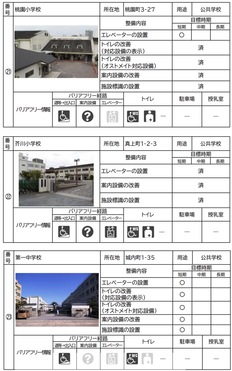 - 平成23年の基本構想策定時より、学校を基本構想における生活関連施設に位置付けている。特定事業として短期・中期・長期で必要な整備内容を各施設の状況を踏まえて個別に整理し、バリアフリー化を推進している。