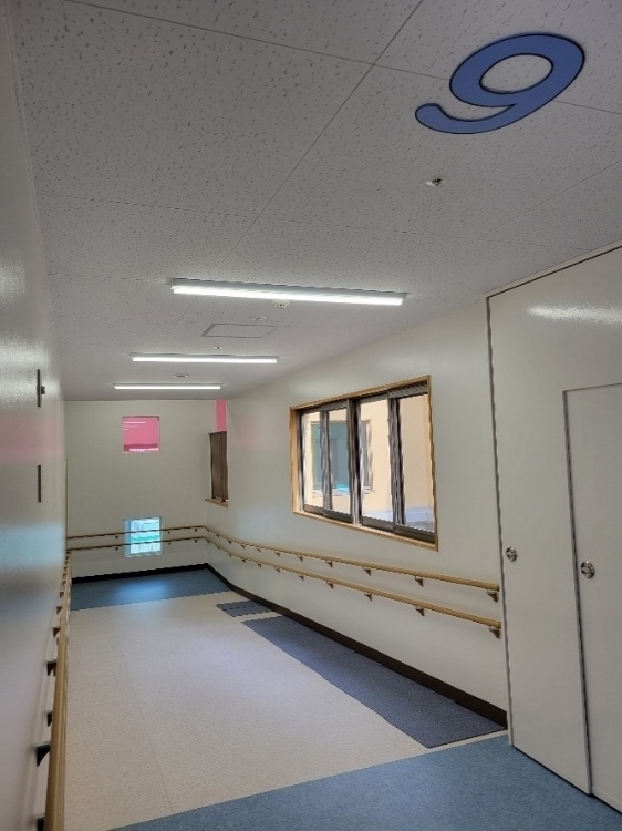 - ストレッチャー等を利用する児童にも分かりやすいよう、天井にも階数表示を設けている。