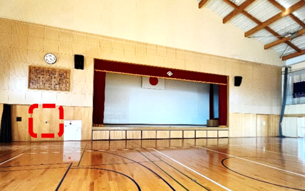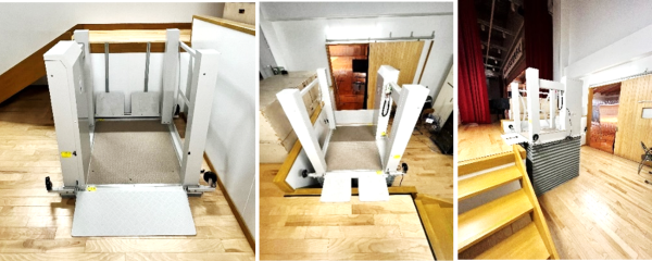 八代市立第六中学校では、体育館改築工事と併せてステージに上がるための段差解消機を設置しています。