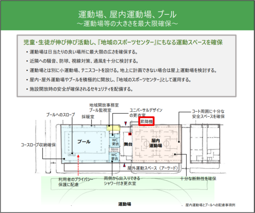 渋谷区が区内の公立小中学校の整備の方針としてまとめた「渋谷区『新しい学校づくり』整備方針」(令和4年5月発行(令和5年3月改訂))において、教室等の整備水準として、屋内運動場の舞台(ステージ)については、昇降機(段差解消機)を設置することが示されています。