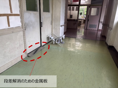 草津市立志津小学校では、既存校舎の段差解消について金属板を敷く等の細かな対応をしています。