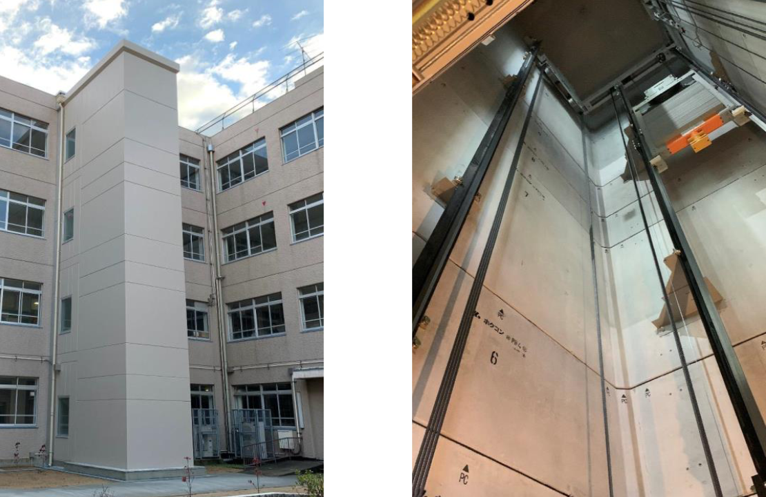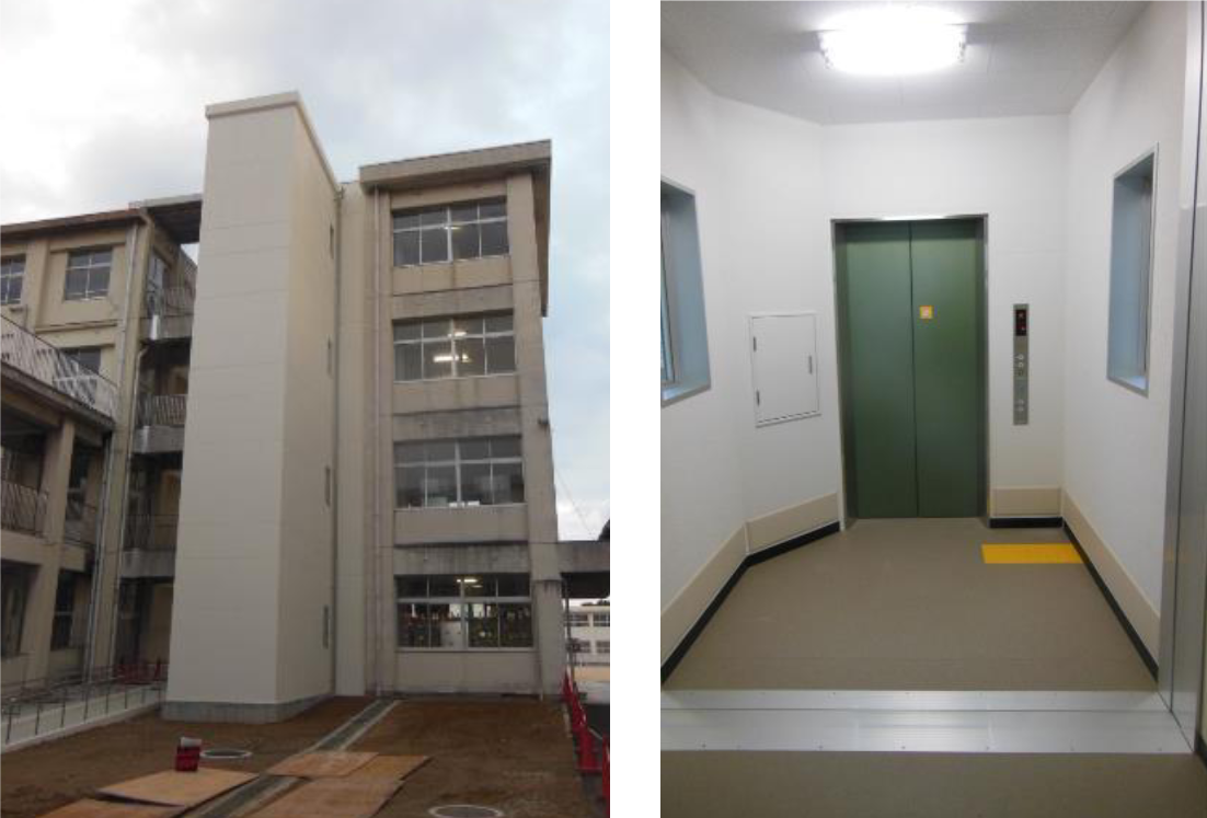近江八幡市立八幡小学校では、令和2年度にエレベーター棟を増築し、視覚障害者のための点字や音声案内装置、聴覚障害者用の応答灯付きインターホン呼びボタン等を備えたユニバーサルデザイン仕様のエレベーターを設置しています。