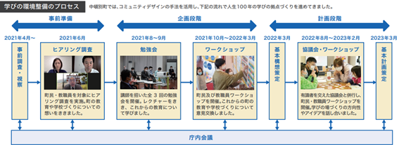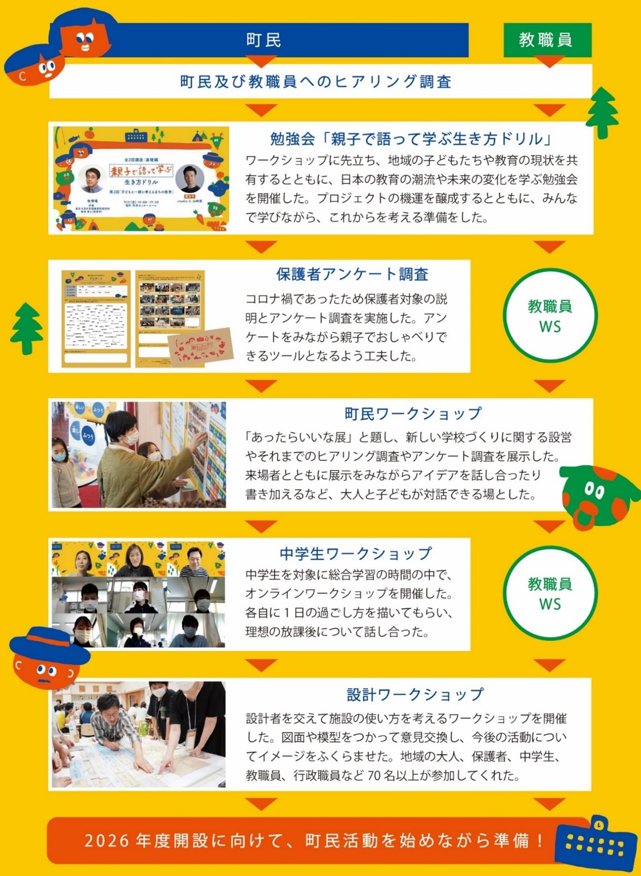 企画段階では、勉強会を3回、町民、中学生、教職員を対象としたワークショップを各1回ずつ実施した。