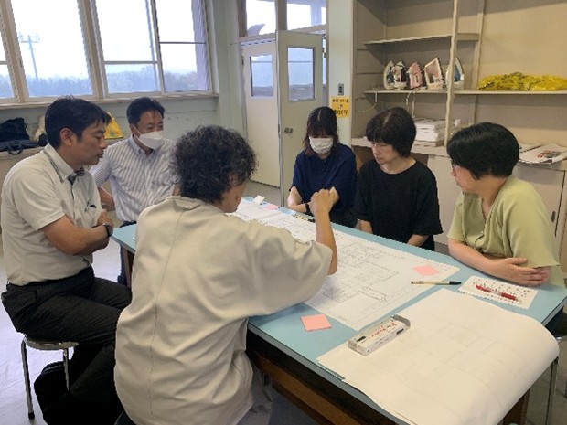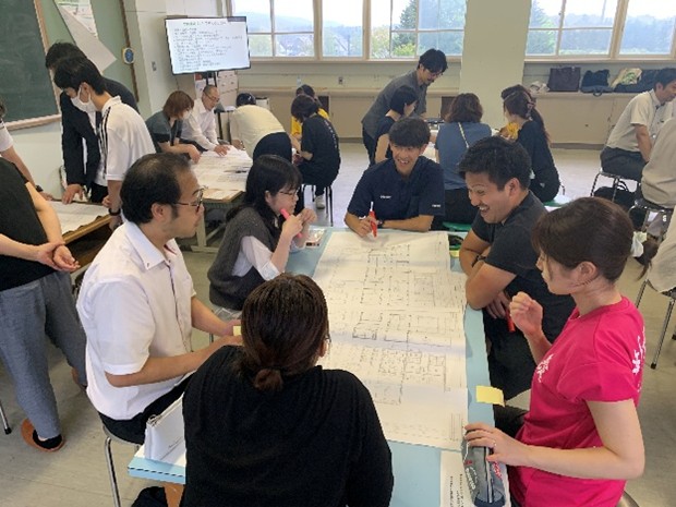 - 小中学校の全教職員を対象とした新しい学校づくりに関する説明会と、小中学校の教職員数 名が代表として参加した全2回の「教職員ワークショップ」を実施した。ワークショップでは、新しい学校校舎や教育施設のハード面、新しい学校施設で実現したい空間や活動のアイディアについて意見交換を行った。