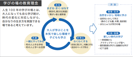 検討を進めていた建設構想を一度仕切り直し、地域でどんな教育を実現したいのかという根本の部分から協議を進めることとした。また、関係者だけでなく、町民とも話し合いながら、参加型で事業を再スタートさせ、町民や教職員とともにワークショップの場で話し合いながら合意形成を図り、新しい学校づくりに向けた基本構想を策定した。