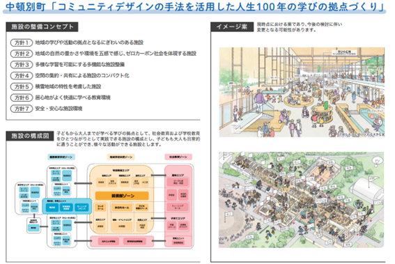 中頓別町では、「3歳から15歳が学べる幼小中一貫の学校にとどまらない、人生100年時代において子どもから大人まで学びつづけることができる学びの拠点」を目指し、構想・計画の段階から住民参加型で検討を進めました。