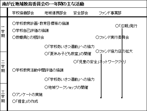 学校と南が丘地域教育委員会は「緊張感のある協働関係」を維持しつつ、「保護者・地域の学校運営への参画」をすすめてきた。学校が年間計画を作成し、Meとの協議を経て保護者・地域に対し、4月に説明会を開くことから1年がスタートする。10月には、前半の学校自己評価をもとに後半の学校運営について中間報告を行う。年度末には保護者・地域のアンケートと自己評価にもとづき、Meからの「提言」を受け、それを次年度に生かしていくという1年を通した「保護者・地域が参画するシステムが定着した。