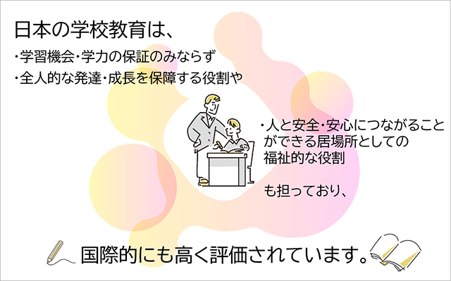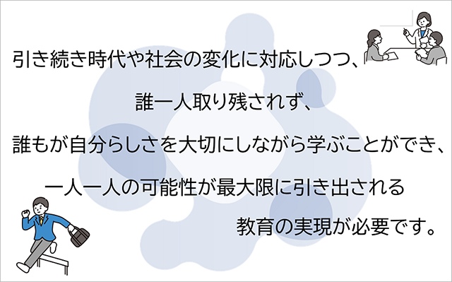 我が国の学校教育は、教師の自己研鑽や学びあいによるたゆまぬ努力と国際的にも長時間の勤務によって支えられてきました。学校における働き方改革を含む「教師を取り巻く環境整備」は、長時間勤務の是正を図ることで、教師の健康を守り、教師自らの人間性や創造性を高め、その意欲と能力が最大限発揮できる勤務環境を整備し、高い専門性を発揮できるようにすることなどにより、学校教育の質を高め、「全ての子供たちへのより良い教育の実現」を図るための取組です。