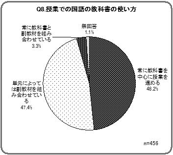 授業での国語の教科書の使用方法は、「常に教科書を中心に授業を進める(48.2パーセント)」に対し、「単元によっては副教材を組み合わせている(47.4パーセント)」と「常に教科書と副教材を組み合わせている(3.3パーセント)」を合わせると50.7パーセントとなっており、常に教科書を中心に授業を進める教員と教科書と副教材を組み合わせて授業を進める教員は、ほぼ同じ割合となっている。