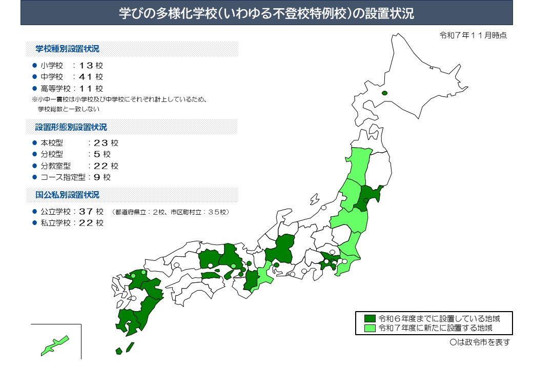 | 47 | 町田市立山崎中学校【分教室名】学びの多様化学校分教室「ゆめのき」(令和7年) | 東京都町田市教育委員会 | 東京都町田市 | 教科の学びや既習体験等を生かしながら、個性の伸長や探究心の涵養を図る「探究活動」、現在の自分の状況を見つめ自己理解を深め、自分らしさ、自分の思いや考えを適切に表現し、伝える等の意見を交流し合う活動を行うことを通じて、コミュニケーション能力の育成や自己肯定感を高めようとする「表現活動」、協働的な学びを踏まえた様々な体験活動を通じて、幅広い考え方や視野の育成、さらには他者理解や多様な価値観を認め合うようにする「体験活動」を主とする「探究の時間」を設定。 | |