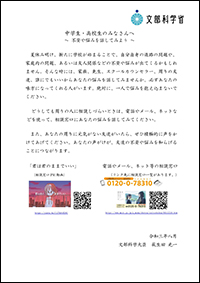 夏休み後の学校が始まって、不安や悩みがあるみなさんへ文部科学大臣からメッセージがあります。 困ったことや嫌なことがあったら、誰でもいいので、話してみてください。 相談窓口一覧はこちらからご覧になれます。 https://www.mext.go.jp/a_menu/shotou/seitoshidou/06112210.htm
