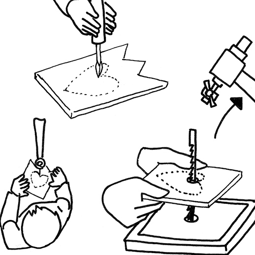 くりぬきたい時は、板にキリで穴をあけ、そこに刃を通し、取り付けます。