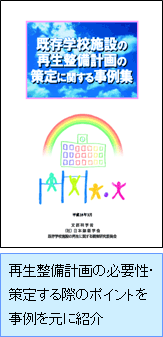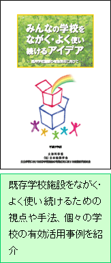 | このセミナーは、耐震補強と合わせて大規模な改修等により、既存の学校施設を現代の教育方法・教育内容に対応させ、また余裕教室等を学校以外の用途にも活用して、学校施設全体をながく・よく使い続けることを、広く普及させることを目的としています。 これまでに作成した事例集「みんなの学校をながく・よく使い続けるアイデア」と「既存学校施設の再生整備計画の策定に関する事例集」の紹介を中心に、耐震化も含めた、既存学校施設をながく・よく使い続けるための視点・手法や、整備計画の必要性・策定する際のポイントなどをみなさんと考えていくため、本セミナーを開催することとなりましたのでお知らせします。 |