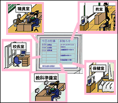 ■校内ネットワークを活用した実践の例 ・調べ学習が広がる 過去の学習成果が再利用できる 調べ学習でのデジタルデータベース利用 ・検索技能の よい見本として 教師の検索動作をさりげなく見せ,センスを磨く ・校内での情報交換 複数の教師による多面的な評価を可能にできる ・電子掲示板による 教師間コミニュケーション どこからでもリアルタイムに情報確認 ・教材研究を共同で 複数の教師による共同教材作成 ・ホームページへの内容の書き込みを簡単に 行事の写真などは、すぐにアップしたいもの。1回1回web作成して、ftpをするのは、手間がかかるはずです。教師誰でもがアップできるようにしています。 簡単に書き込めるホームページ掲示板 ・教育委員会との連携 e-mailでの情報提携 ↑ページの先頭へ ←「こんなことがてきる1」に戻る