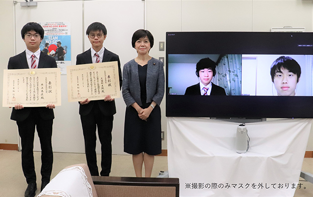 8月1日、2022年度国際生物学オリンピックに日本代表として出場した生徒の皆さんが、結果報告のために対面及びオンラインで鰐淵文部科学大臣政務官を表敬訪問しました。鰐淵政務官は文部科学大臣表彰を授与し、お祝いと労いの言葉を伝えました。