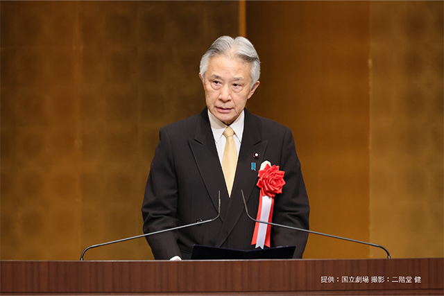 盛山大臣は挨拶で、国立劇場、国立演芸場は、多くの人々に伝統芸能の魅力を伝え続け、伝承者の養成においても重要な役割を担っていると話しました。