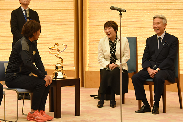 ソフトボール女子日本代表は2014年以来となる4度目の優勝に輝き、岸田首相から御祝いの言葉と共に、2026年の愛知・名古屋アジア競技大会やオリンピック競技として復活する2028年ロサンゼルスオリンピックでの活躍への期待が述べられました。