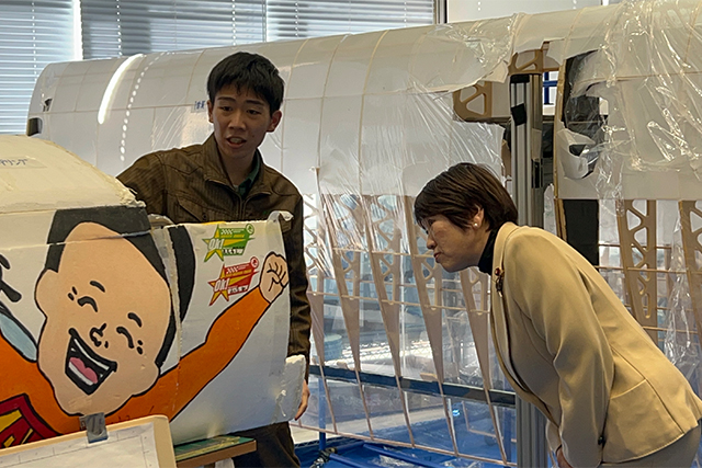 愛知総合工科高等学校専攻科では、産業界と連携した高度な技術・技能を修得した専門人材の育成等に取り組んでおり、その説明を受けた後、実習授業を視察し、生徒の皆さんから、各自が取り組む自動運転技術や航空機製作等に関するプロジェクトについて説明を受け、意見交換を行いました。