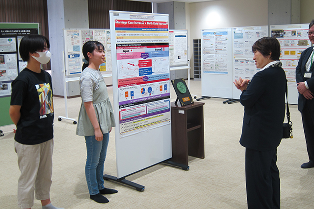 名古屋大学教育学部附属中・高等学校では、結婚率と出生率の関係に関する探究活動の成果についてのプレゼンに対して、あべ大臣から質問を投げかけるなど、英語による活発な議論が行われました。また、大学の教育リソースを活用した先進的な教育活動を拝見するとともに、門松名古屋大学副総長をはじめとする関係者と、教師の実践的な研修の場ともなる附属学校の在り方等について意見交換を行いました。