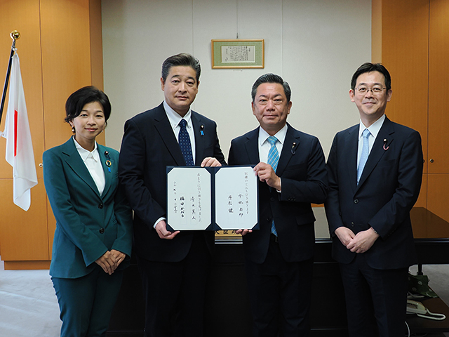 左から:福田かおる新大臣政務官、清水真人新大臣政務官、金城泰邦前大臣政務官、赤松健前大臣政務官