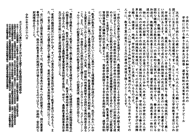 全国集会では、主催者である教育関係団体連絡会の各代表者など約300名の教育関係者や来賓として各党の代表国会議員が出席し、令和8年度からの中学校35人学級のための教職員定数の改善などを含めた「新たな定数改善計画」や学校における働き方改革を強力に進めるための諸施策の実現などを求める「子供たち一人一人に対するきめ細かな教育の実現のための学校における働き方改革及び指導・運営体制の充実等を求めるアピール」が採択されました。
