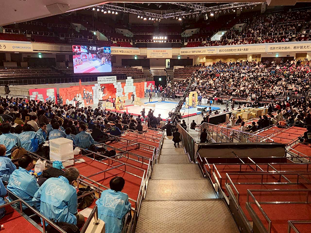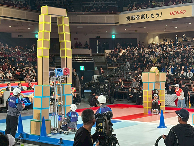 38回目を迎えた今大会は地区予選で選抜された25チームが出場しました。今回のロボコンでは、ロボットがボックスを積み上げてゲートを作り、ロボットと人が乗った台車を連結させ、そのゲートを通過する回数やゲートの高さによる得点が競われました。トーナメント形式で行われた大会は、各チームが様々な戦略と技術を駆使した白熱した試合の連続となり会場は大いに盛り上がりました。