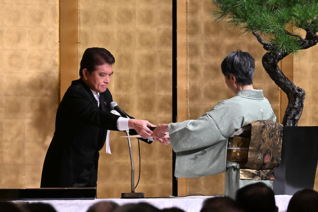 12日は、叙勲受章者を代表して瑞宝中綬章を受章された出口利定氏(元東京学芸大学長)へ勲章と勲記を、褒章受章者を代表して紫綬褒章を受章された水口咲氏(漆芸作家)に対し褒章と章記を中村副大臣から伝達しました。