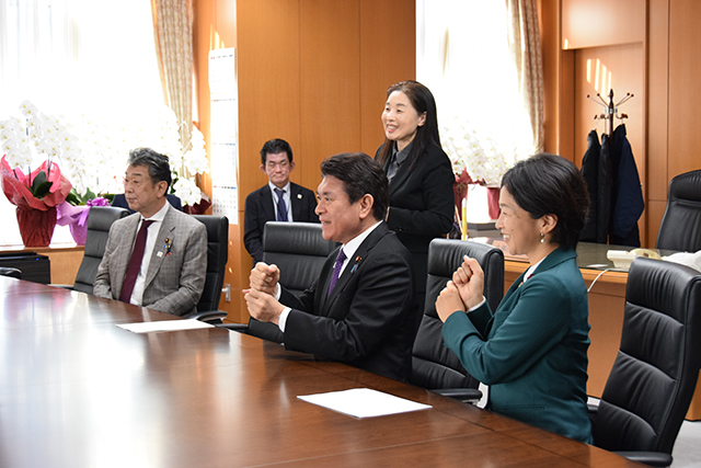 12月17日、全日本ろうあ連盟の石橋大吾理事長、小林泉事務局次長、倉野直紀デフリンピック運営委員会事務局長と、東京2025デフリンピックで金メダルを獲得した茨隆太郎選手(水泳)、金子陽音選手(空手)、矢ケ部紋可選手(バドミントン)、山田真樹選手(陸上)が松本大臣を表敬訪問されました。表敬訪問には中村副大臣、小林副大臣、清水大臣政務官、福田大臣政務官、 河合スポーツ庁長官が同席しました。