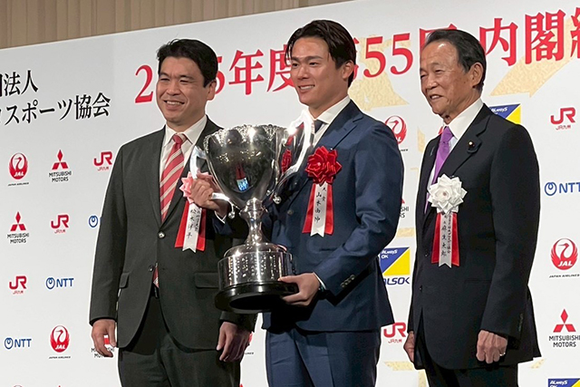 また、今年度の内閣総理大臣杯日本プロスポーツ大賞は、MLB ワールドシリーズ制覇に大きく貢献されたロサンゼルス・ドジャースの山本由伸投手が受賞され、松本大臣からトロフィーを授与しました。