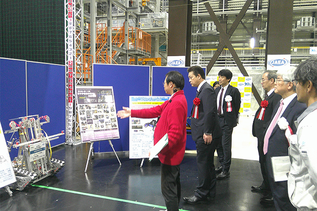 廃炉創造ロボコンは今年で10回目を迎え、会場には過去の受賞ロボットが展示されておりました。清水大臣政務官は「これまでも、若い方々の柔軟な発想により、創意工夫あふれるロボットが開発され、様々な難しい課題に挑戦してきたことは本当に意義深いことであると思います」と感想を述べました。