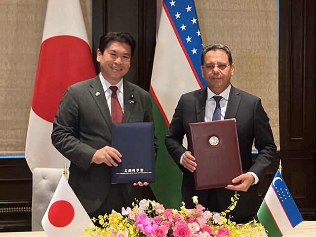 12月20日、松本大臣がウズベキスタンとの覚書等署名式に出席し、ウズベキスタンのシャリポフ高等教育・科学・イノベーション大臣及び平田駐ウズベキスタン大使とともに、両国政府間の高等教育・研究分野における協力に関する取り決めに署名しました。