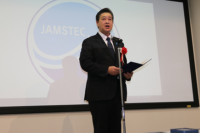 式典においては、清水大臣政務官が、「みらい」の功績を讃え、関係者に御礼を申し上げるとともに、「みらいⅡ」への期待を述べました。また、JAMSTECの河野理事から、「みらい」を用いた観測・調査航海による研究開発成果について講演いただきました。その後、「みらい」の初代船長等への花束贈呈がおこなわれました。