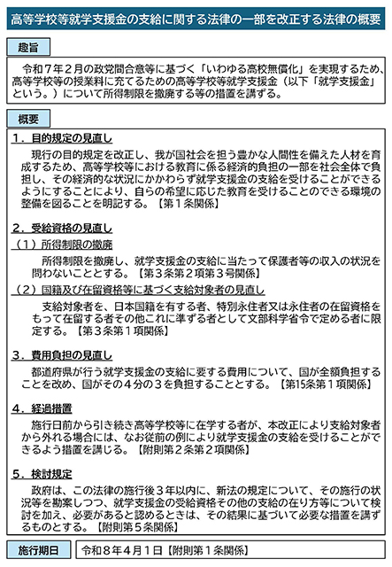 1本目は、高等学校等就学支援金制度の拡充(令和7年2月の政党間合意等に基づく「いわゆる高校無償化」を実現するための、高校生等に対する授業料支援の拡充)を行う「高等学校等就学支援金の支給に関する法律の一部を改正する法律案」です。