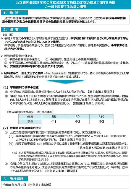 2本目は、令和8年度からの中学校35人学級の実施等を行うための「公立義務教育諸学校の学級編制及び教職員定数の標準に関する法律の一部を改正する法律案」です。