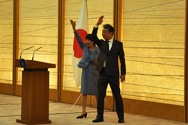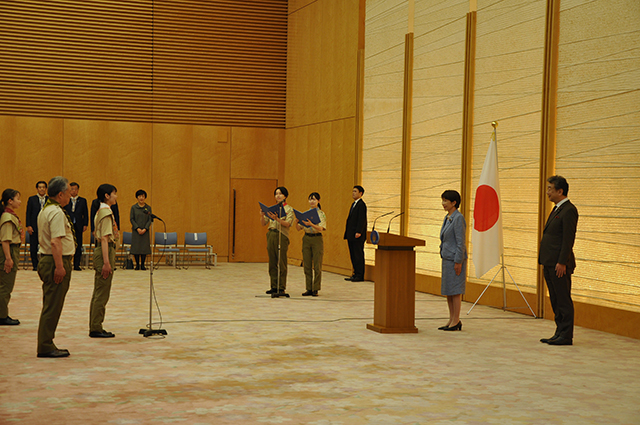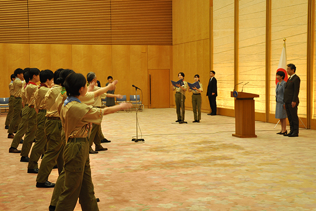 最後に、受章された皆さんから、高市総理と中村副大臣に対して、ボーイスカウトのエールである「弥栄(いやさか)三唱」(良いことは益々よくなるように、災いも転じて福となすように、という意味がある)が送られた後、高市総理と中村副大臣からも、お返しのエールが送られました。