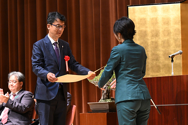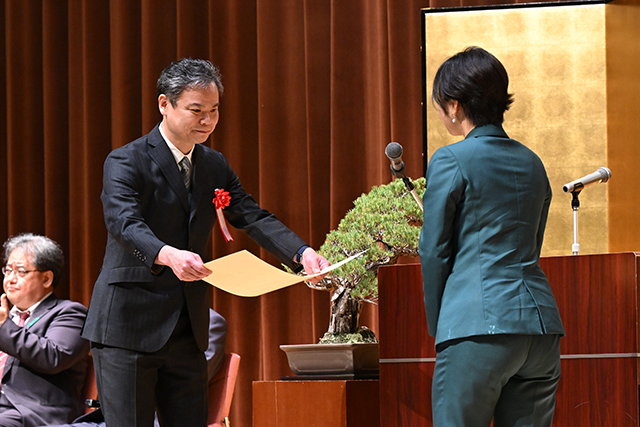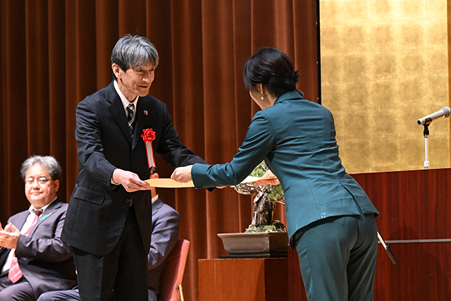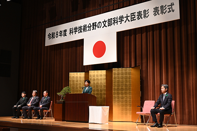 4月15日、表彰式を執り行い、科学技術賞の各部門、若手科学者賞、研究支援賞の各部門のそれぞれの代表者に福田大臣政務官から表彰状を授与しました。