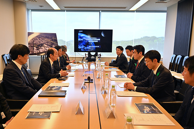 4月16日、松本大臣はJAXA筑波宇宙センターを訪れ、宇宙開発利用に関する技術開発などの現場を視察しました。