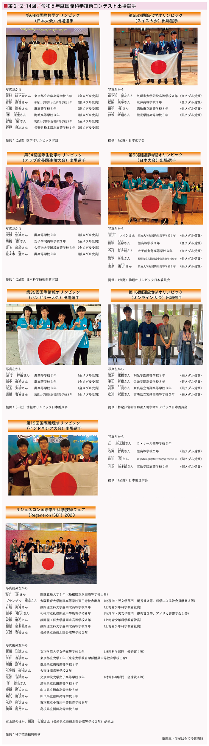 また、数学、化学、生物学、物理、情報、地学、地理の国際科学オリンピックや国際学生科学技術フェア(ISEF(※260))等の国際科学技術コンテストの国内大会の開催や、国際大会への日本代表選手の派遣、国際大会の日本開催に対する支援等を行っている(第2-2-14図)。