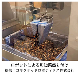農林水産省では、農林水産省中小企業イノベーション創出推進事業により、令和5年度からロボットによる惣菜盛り付けシステムの社会実装に向けた大規模実証を支援しています。様々な惣菜の盛り付けに対応するためのハンドの多様化や、業界全体へ本技術を普及するための低価格化、盛り付け容器の供給や小袋の移載も含めた惣菜盛り付けに係る一連の工程を自動化するシステムの開発等が予定されており、惣菜製造分野の生産性向上と人手不足の解消が期待されます。