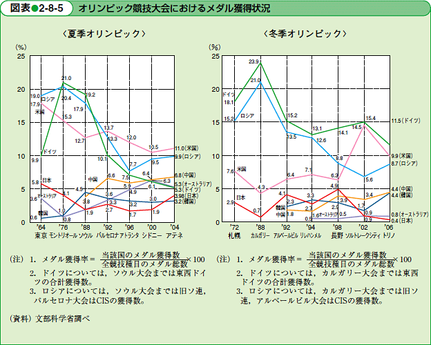 我が国のスポーツの国際的な競技力の向上を図っていくことは重要な課題です。過去のオリンピック競技大会におけるメダル獲得状況を主要各国と比較した場合,我が国の国際競技力は長期的・相対的に低下傾向にありました(メダル獲得率の推移については,図表2-8-5を参照)。