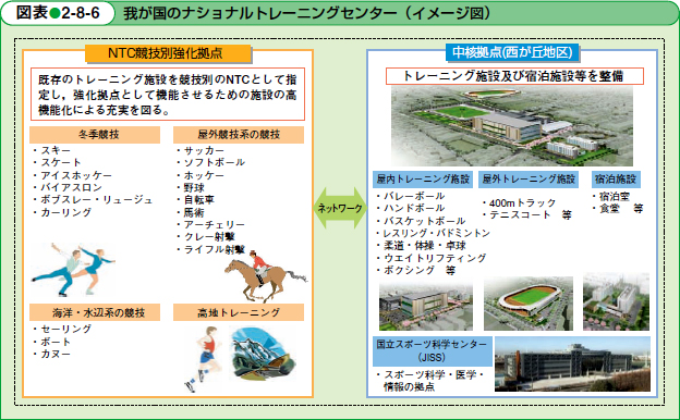 中核拠点では対応できない冬季競技,海洋・水辺系競技,屋外系競技及び高地トレーニングについては,既存のトレーニング施設を競技別のナショナルトレーニングセンターに指定するとともに,医・科学サポートや中核拠点とのネットワーク化を図るなど,強化拠点として機能させるための施設の高機能化に関する事業を実施することとしています(図表2-8-6)。