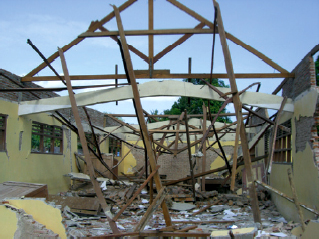 | ▲被害のひどかったプラレット郡Bauran村の,6か月前に建てられたばかりの全壊した小学校の校舎 |