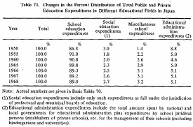 The distribution of total public and private education expenditures in Japan among different fields of education, for 1950 -1968 is analyzed in Table 71.