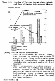 As shown in Chart 1-22, entrants into graduate schools in 1975 included 16,000 admitted to the master's course and 4,000 admitted to the doctor's course, who were 4.6 times and 1.9 times the figures in their respective categories in 1960. The growth in the number of students admitted to the master's course has been remarkable particularly since 1965. In the meantime, the rate of university student advancement to these two postgraduate courses has been in a downward trend since the peak year of 1965 due to the rapid increase of undergraduates in subsequent years.